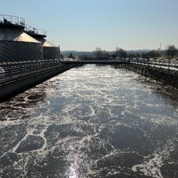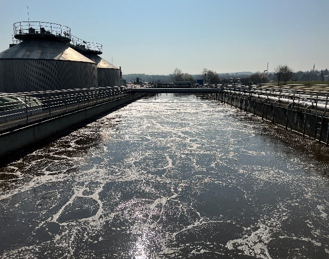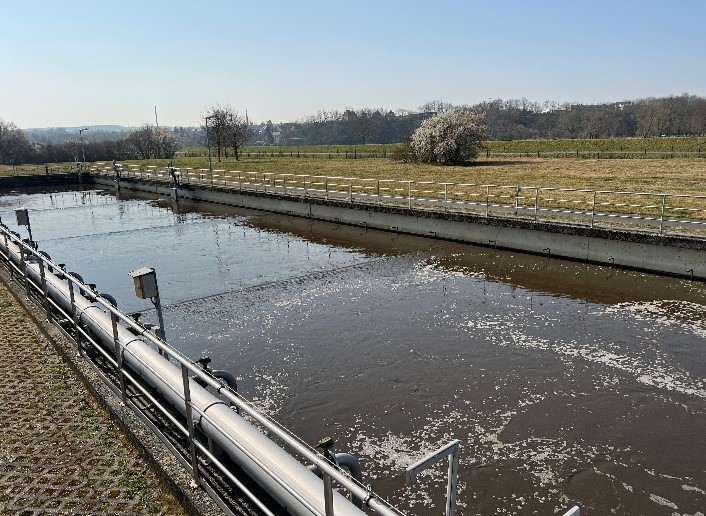 Das nitrathaltige Abwasser im Ablauf der Kaskade 5 (Nitrifikationszone) wird mittels Rezirkulationspumpen in die Kaskade 1 zurückgeführt und durch Veratmung zu Stickstoff reduziert. Die Umwälzung des Abwasser-/ Belebtschlammgemisch in der Denitrifikationszone erfolgt über Rührwerke. Der für die Nitrifikation erforderliche Sauerstoff wird über 3 Aerzen-Drehkolbengebläse (Lufteintragsmengen: min. 1.500 m³/h und max. 15.000 m³/h) und Envicon- 790 Keramik- (790 Stück) / Membranbelüfter (612 Stück) in die Belebung eingetragen. Als Bemessungstemperatur wurde 10°C gewählt, damit die Ablaufwerte sicher eingehalten werden.