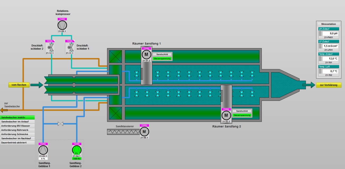 Im Auslauf des Sandfangs ist die Zulaufmessstation angeordnet (stationärer Probenehmer). Hier erfolgt die kontinuierliche Messung der Parameter: pH-Wert, elektrische Leitfähigkeit, Außenlufttemperatur und der Abwassertemperatur.